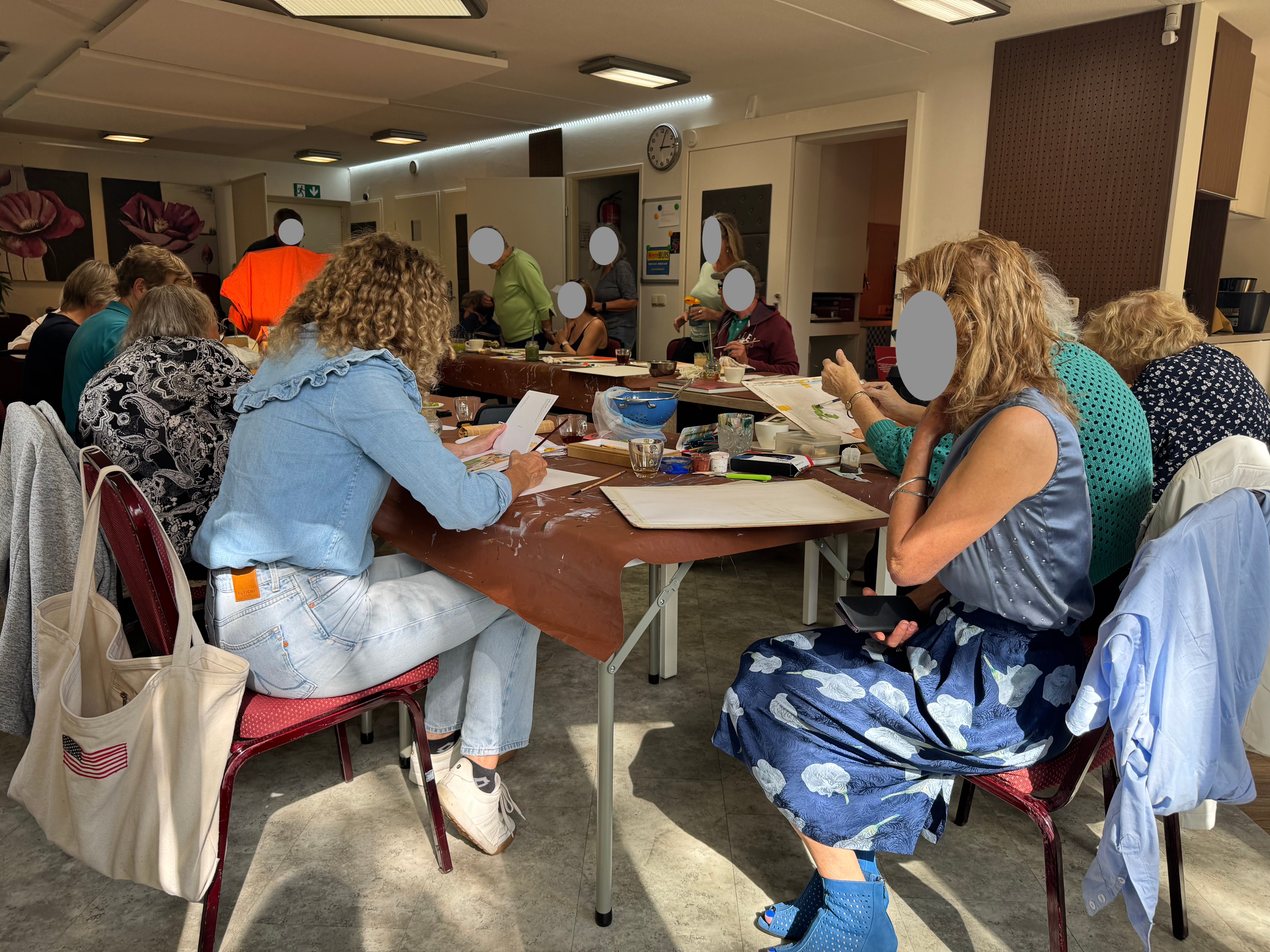 Vantevoren wordt door beheerder Christa en een vrijwilliger de tafels en de schildermaterialen klaargezet en iedereen is welkom om aan te schuiven.